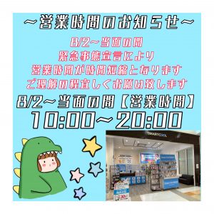 アリオ八尾が時短営業になるため、スマートクールアリオ八尾店も時短営業になります!
