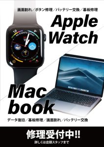詳しい修理料金は店頭でご案内しておりますので、Applewatch、Macbookの故障・トラブルでお困りの際はぜひお気軽にご相談くださいませ。
