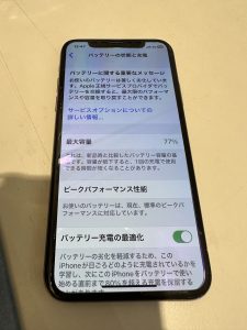 しかし経年劣化により、バッテリーの最大容量が77%でした…。
