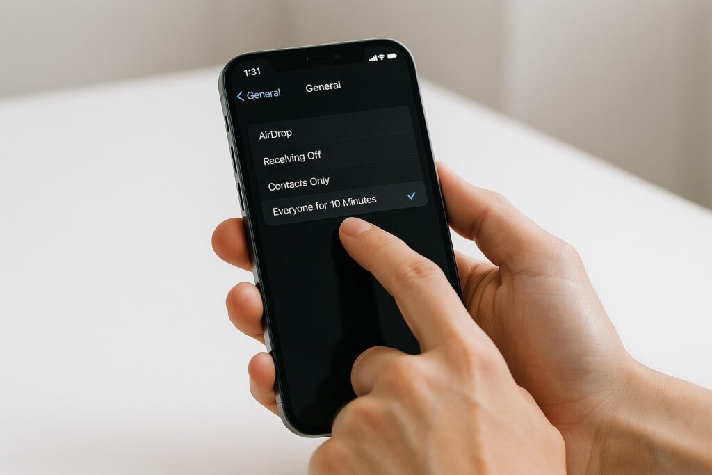 まずiPhone側でAirDropを「全員(Everyone)」にしておき、そのうえで写真やファイルを共有メニューからAirDropで送信します。