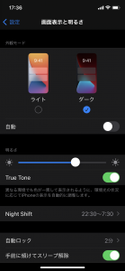 iOS13以降で利用可能となった機能で、画面の配色を黒基調に変更する「ダークモード」です。黒基調の画面のほうが、従来のライトモードよりもバッテリーが長持ちする、目に優しいなどのメリットがあります。