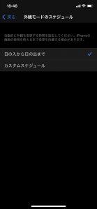 「オプション」から、ダークモードを適用する時間を変更することができ、「日の入りから日の出まで」と「カスタムスケジュール」の2種類が選べます。