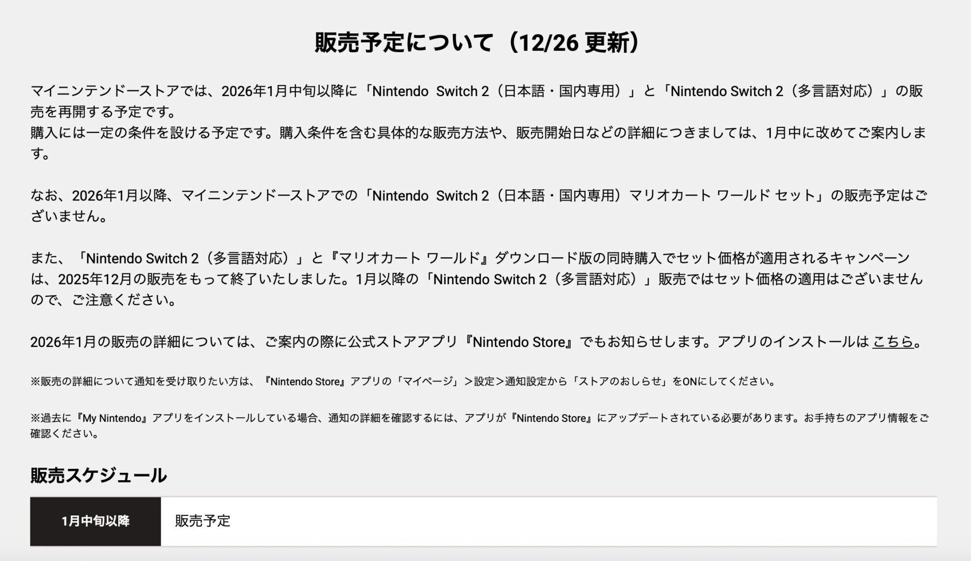 1月に入り、Nintendo Switch 2がマイニンテンドーストアで販売再開される予定との情報が出てきています。
