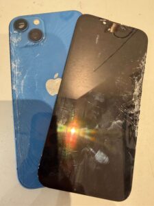 八尾市よりご来店いただき、iPhone13の修理をご依頼いただきました。今回はなんとバイク走行中に端末を落としてしまい、画面・背面ともに大きく破損したケースです。見た目が派手に割れていても、当店では状態を見極めて最短ルートで復旧を目指します。経験豊富なスタッフが点検し、今回は約2時間でデータそのままでお返しできました。