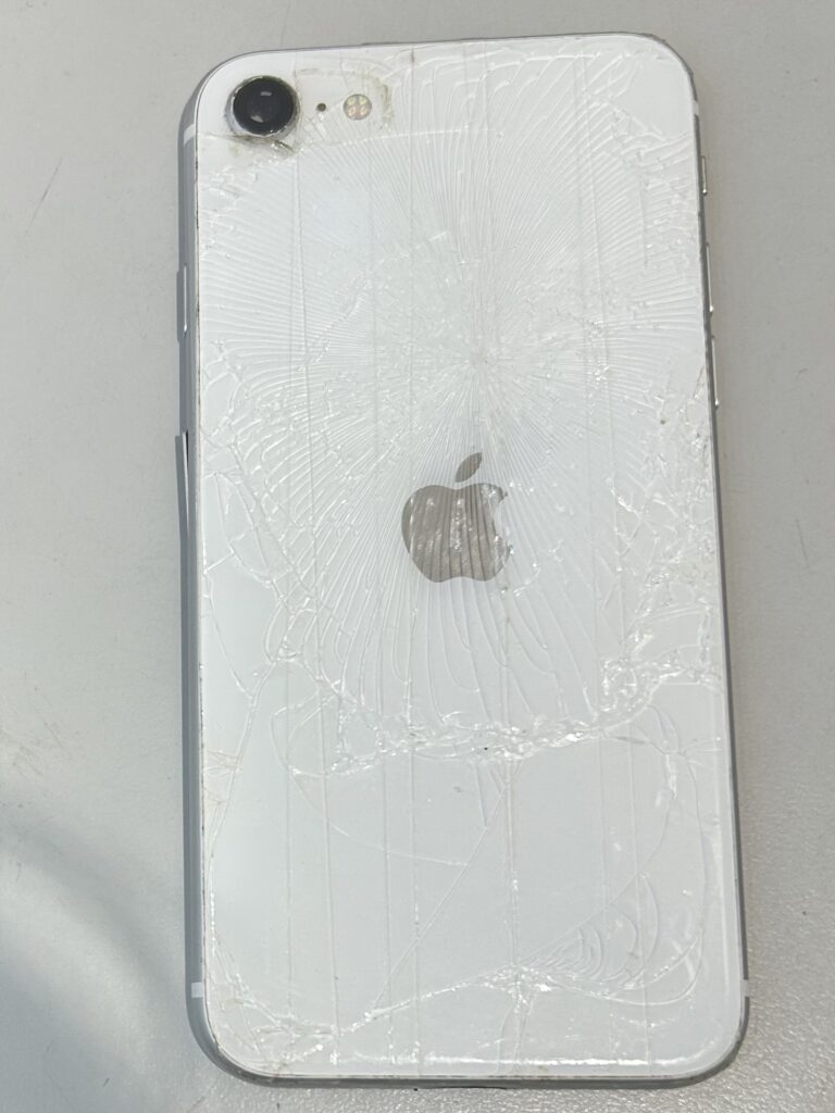 お持ち込み時のiPhone SE(第2世代)は、背面ガラス全体にヒビが入り、全体的に細かく割れている状態でした。