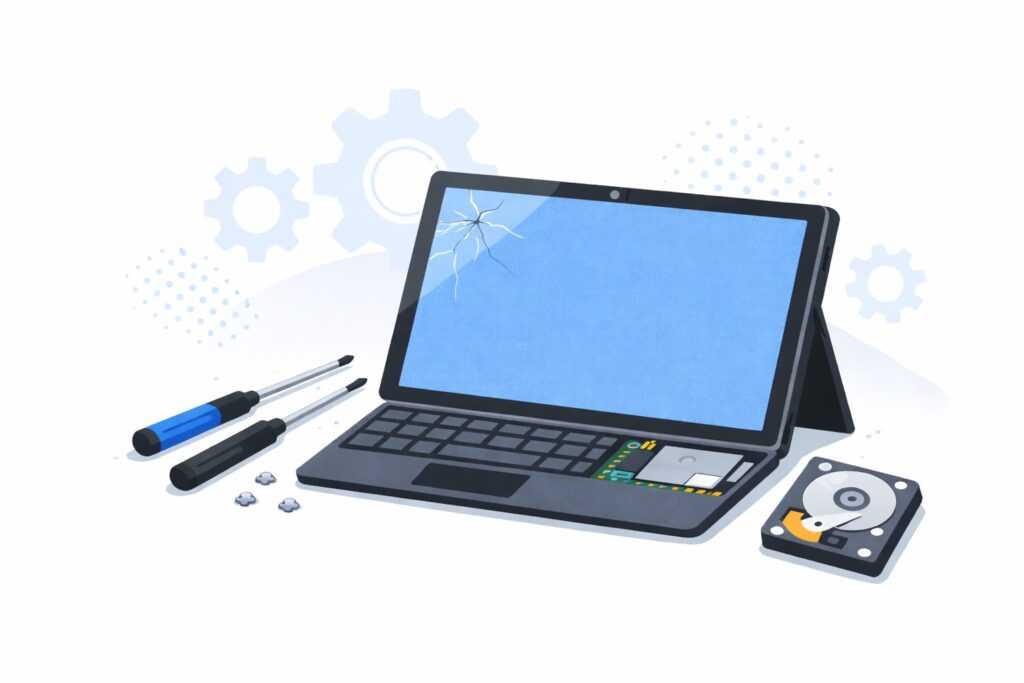 Surfaceのメーカー修理では、本体交換扱いになることや初期化が前提になるケースもあります。そのため、保存しているデータや設定環境が消えてしまう可能性があります。一方で、パーツ単位の修理が可能な場合は、必要な部分だけを交換して復旧できることがあります。