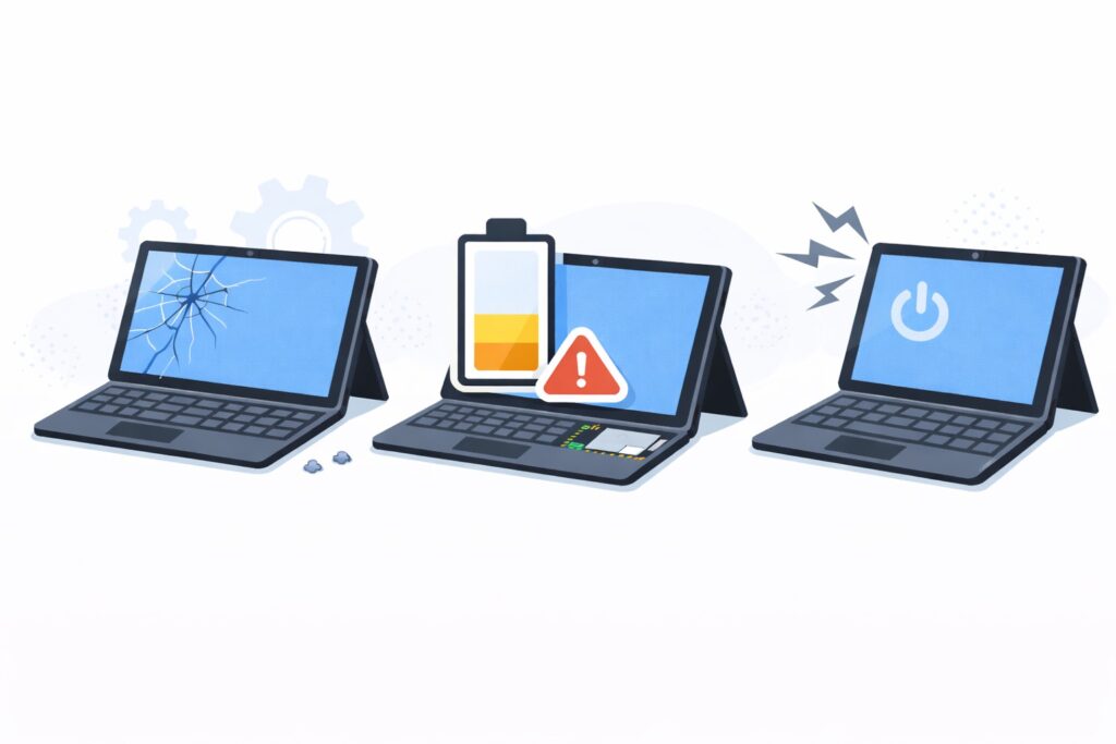 Surfaceシリーズは軽量で高性能な反面、画面割れやバッテリー劣化、起動トラブルなどが起きた際に対応できる店舗が限られています。