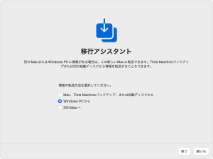 3.Macの移行アシスタントで「WindowsPC」からを選択して「続けるを押します」