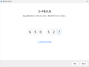 5.Surfaceの移行アシスタントでコード入力画面まで進み、先ほどMacの移行アシスタントに表示されたコードを入力します。