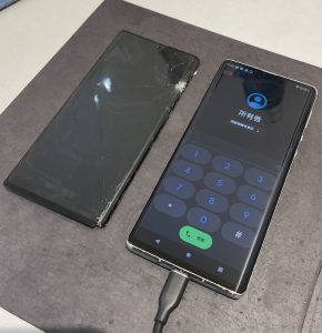 この様な症状の場合、大抵は画面交換修理をすれば動作は正常に戻る為こちらの端末も画面交換修理をさせて頂きました。