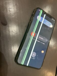 お持ち込み頂いたスマホは、落としてしまい画面に緑の線が入ってしまっていました。