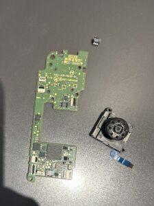 Joy-ConのRボタンは基盤に半田付けされているされているため煙、の出る作業のできない当店では基盤の交換を行います。