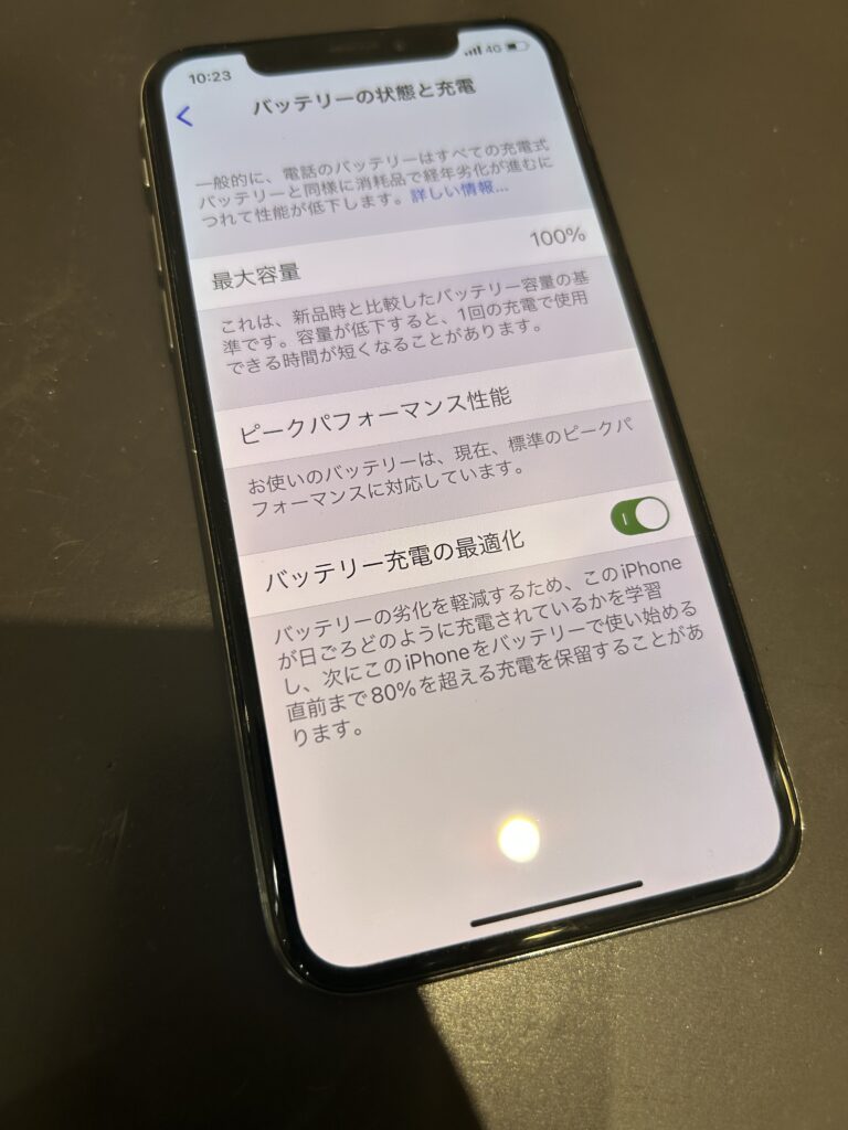 バッテリー交換後は、最大容量が100%に回復し、ピークパフォーマンス性能も正常な状態になりました。