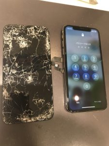 アイフォンXをお使いのお客様でして、かなりの勢いで落としてしまい画面のガラスがバキバキに割れてしまった、、
