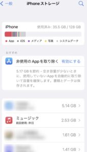 「設定 > 一般 > iPhoneストレージ」から空き容量を確認します。